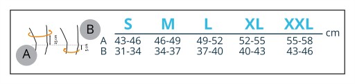 Окружність 15 см над колінною чашечкою - 46-49 см, 5 см нижче колінної чашечки - 34-37 див.