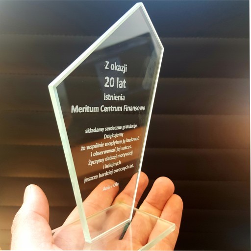 Відповідь: Статуетка виготовлена з польського скла товщиною 6 мм, із застосуванням сучасної технології лазерного гравіювання на склі.