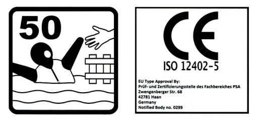 - Він має сертифікат ISO 12402-5 і відповідає європейському стандарту плавучості 50N