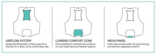 - СИСТЕМА ПОВІТРЯНОГО ПОТОКУ: внутрішня підкладка EVA, яка утримує поверхню рятувального жилета від шкіри