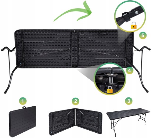 Розкладний стіл для кемпінгу/кейтерингу. Дуже практичний і легкий. Конструкція зі сталі. Стільниця виготовлена з міцного пластику. У складеному вигляді столик утворює практичну валізу, тому займає мало місця і його легко транспортувати.