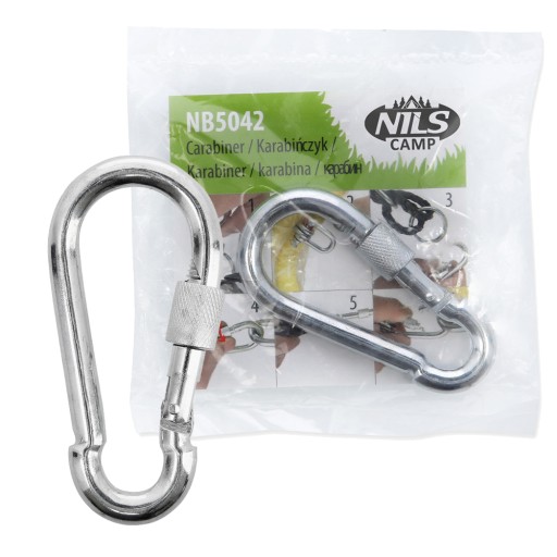 NB5042 NILS CAMP - це сталевий карабін з поворотним механізмом. Його закриття є не тільки засувкою, але і заглушкою. Співвідношення його ваги і міцності дуже вигідне. Виріб важить всього 9 г, а його максимальне навантаження становить 500 кг. Він дуже простий у використанні. Найчастіше використовується для з'єднання канатів.
