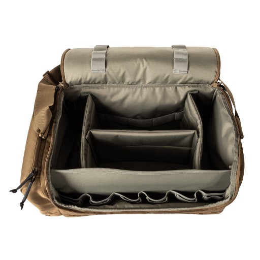 У тренувальній сумці Range Ready є місце для всього, що вам потрібно протягом дня на стрільбищі. Повністю м’яка поліетиленова основа для безпечного зберігання вашого спорядження та знімні перегородки для адаптації сумки до ваших потреб. Внутрішня гнучка панель для зберігання та аксесуарів із швидким доступом, а також еластичні петлі під кришкою забезпечують комфорт, і це лише основне відділення. Три бічні відділення та ремені MOLLE дозволяють взяти ще більше.