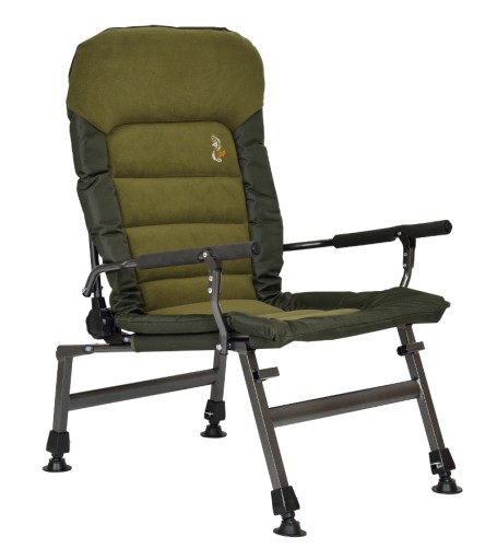 Крісло характеризується новою посиленою конструкцією, широким, дуже зручним сидінням і високою регульованою спинкою для положення лежачи. Кожна ніжка регулюється окремо, що дозволяє розміщувати її на нерівній місцевості, і має широкі ніжки, щоб запобігти падінню на м'якій землі. Крісло також оснащене системою кріплення підставки для ніг і дуже зручними підлокітниками, покритими міцним, приємним на дотик поролоном. Матрац виготовлений з високоякісного водонепроникного матеріалу, додатково потовщеного 3 см поролону. Він також має зручний підголівник, потовщений поролоном і оброблений приємним на дотик зеленим флісом.Всі ці зміни та переваги створюють ідеальне крісло для тривалої риболовлі.
