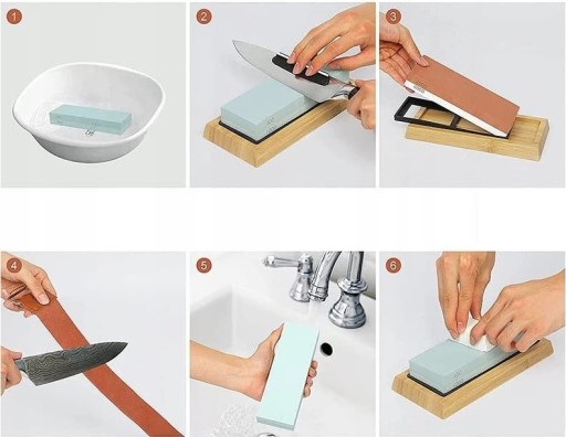 2. Перед початком заточування рекомендуємо надіти захисні рукавички і поставити бамбукову підставку на стіл або рівну поверхню. Завжди починайте заточувати з каменів меншої зернистості (400 → 1000; 3000 → 8000), починаючи з 400 або 1000 (залежно від зносу леза). Камені з більшою зернистістю використовуються для полірування і згладжування країв, надання лезам блиску і максимальної гостроти.