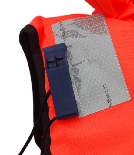 Рятувальний жилет 100N для людей вагою 30-40 кг, обхватом грудей 70-80 см, оснащений двома видами застібок - пряжкою і блискавкою. Додатковий захист забезпечує промежинний ремінь, який запобігає вислизанню жилета, і комір, який утримує голову над водою. Відповідне розташування матеріалу плавучості гарантує, що людина залишається у вертикальному положенні. Жилет додатково оснащений свистком і відбивачами SOLAS.