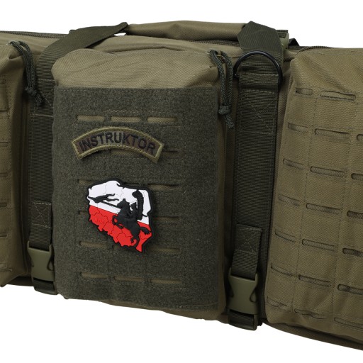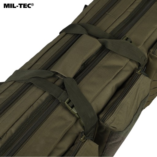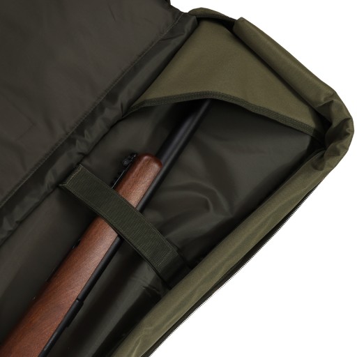 Найбільше відділення вміщує 2 довгі зброї (104 x 30 см). Завдяки липучкам і косим кишеням зброя не рухається під час транспортування. Додатково посередині є м'яка роздільна перегородка.