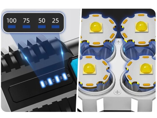 - Два джерела світла: панель LED COB і 4xLED XPE