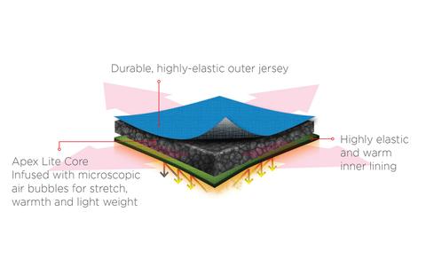 - Серцевина Apex Lite наповнена мікроскопічними бульбашками повітря, що робить її еластичнішою, теплішою та легшою, ніж традиційний неопрен.