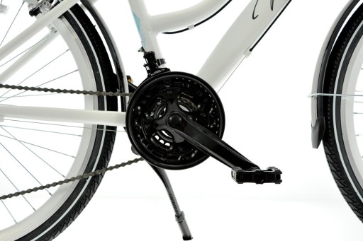 Велосипед оснащений зручним сідлом, комплектом освітлення, бризковиками та багажником. Заслуговує на увагу амортизаційна вилка, яка позитивно впливає на комфорт їзди на різних бездоріжжях. Іншими перевагами даної моделі є двокамерні диски, підшипникова вставка і міцна алюмінієва нога. Велосипед підходить для молоді 8-15 років - чудово підійде як подарунок до Першого Причастя.