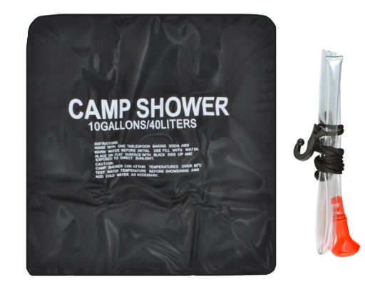 У набір входять спеціальні аксесуари, які дозволяють повісити душ, наприклад, на гілку. Шланг з душовим наконечником дозволить вільно управляти струменем води під час купання. Додатково в отвір, через який тече вода з бака, встановлюється спеціальний клапан, який видає відповідний струмінь або просто перекриває воду, щоб вона не текла. У складеному вигляді кемпінговий душ компактний - поміститься в будь-який рюкзак, не займаючи багато місця. Це відкриває великі можливості під час гірських походів - маючи з собою душ, ви можете користуватися гарячою водою будь-де. Матеріал, з якого виготовлена ємність, покритий спеціальним теплопоглинаючим покриттям і стійкий до механічних пошкоджень.