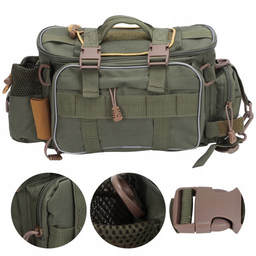 1. Сумка для зберігання рибальських снастей виготовлена з нейлонової тканини, яка є міцною на розрив і має широкий плечовий ремінь для зручного носіння.