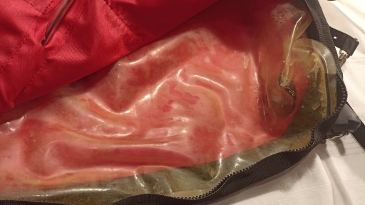 Внизу є кисневий балон (порожній) для накачування жилета для швидкого екстреного підйому. Додатково киснева дихальна трубка від жилета. Швидкий клапан для випуску кисню з жилета. Пляшка порожня без кисню. Стан жилетки невідомий. Після відкриття жилетки на блискавці всередині є гумова вставка. Його необхідно промити водою.