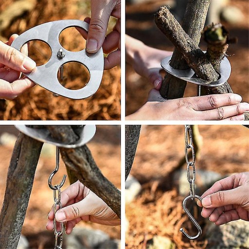 Просто вставте гілки або палиці відповідної довжини та товщини в отвори в диску, перемістіть їх і обережно затягніть. На підготовлену підставку можемо повісити чайник, решітку або навіть невеликий казанок.