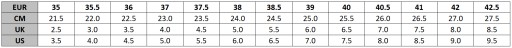 Значення, наведені в таблиці, є орієнтовними і можуть дещо відрізнятися в залежності від обраної моделі. На посадку взуття впливає не тільки її конструкція (включаючи використані матеріали), але перш за все анатомічна будова стопи - її довжина, ширина і висота супінатора.