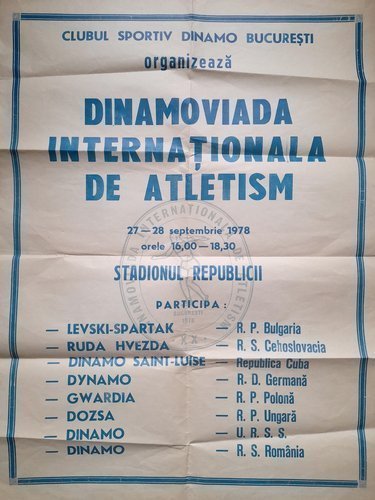 : Оригінальний великий плакат, що анонсує міжнародні змагання з легкої атлетики - Динамовіаду - на Стадіоні Республіки в Бухаресті (Румунія). Господарем змагань був клуб «Динамо» Бухарест, у заході також взяли участь: легкоатлетичні команди Левскі-Спартак Софія (Болгарія), Динамо Сент-Луїза (Куба), Гвардія Варшава (Польща) і Динамо Берлін (НДР).