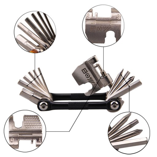Багатофункціональний інструмент «все в одному»: шестигранна 2/2,2/3/4/5/6 мм, плоска викрутка, хрестоподібна викрутка, торцевий подовжувач, T25, набір ріжкових ключів із 2 частин, внутрішній різак, набір гайкових ключів зі спицями з 4 частин