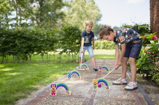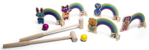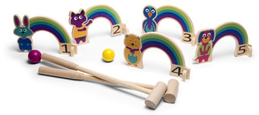 Райдужний крикет із кумедними тваринами — чудова гра для довгого дня. Розмістіть тварин, а потім спробуйте потрапити м'ячем у ворота. Переможцем вважається той, хто проведе м'яч через усі ворота за найменшу кількість ударів. Спортивні розваги для будь-якої поверхні!