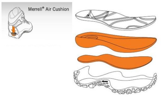 Air Cushion Midsole - запатентована Merrell проміжна підошва з повітряною подушкою (Merrell Air Cushion Midsole) поглинає удари та покращує стабільність. Використовується тільки у взутті Merrell. Під тиском п'яти подушка стискається таким чином, щоб поглинати тиск, що дорівнює чотирикратній вазі тіла, що значно підвищує комфорт руху. Крім того, повітряна подушка створює своєрідне поглиблення, в якому знаходиться п'ята, що дозволяє ще краще стабілізувати стопу у взутті. Коротко кажучи: проміжна підошва Merrell Air Cushion Midsole забезпечує комфорт і амортизацію кросівок для бігу, а також стабільність і контроль, як у кросівках для активного відпочинку.