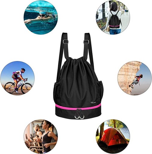 Сумка на шнурках Ryaco — це чудова сумка з прозорою пластиковою кишенею в основному відділенні, яка дозволяє носити чисті та брудні речі в одній сумці, але в різних кишенях. Ідеально підходить для купальників, змінного одягу чи інших речей, які не протікають. вологі речі.