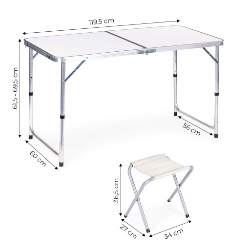 Набір можна скласти в зручну валізу. Табуретки, що входять до комплекту, поміщаються в простір під стільницею.