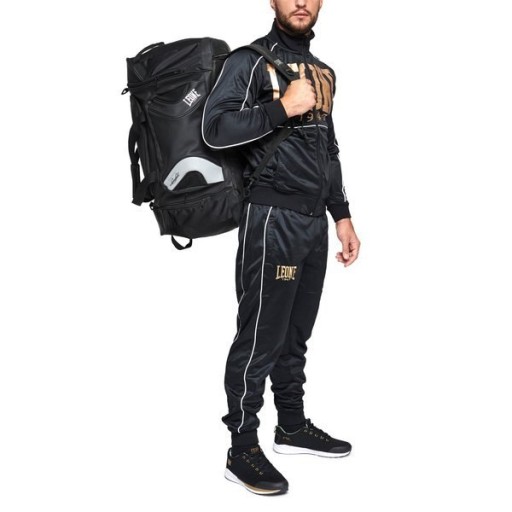 Новий спортивний костюм Leone1947, модель PREMIUM (код товару AB300), зручний, практичний і ефектний одночасно. Великий логотип на грудях і золота обробка прикрашають його і роблять його зручним для тих, хто хоче виділитися в нетривіальному одязі. Штани були збагачені написом збоку «we are combat sports», а прорізи на щиколотках і шнурки на талії роблять їх ще більш зручними та практичними.