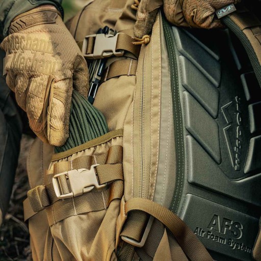 З боків і на лямках вшиті стрічки PALS стрепінг-системи MOLLE, які дозволяють носити елементи так званого спорядження поза рюкзака. термінова потреба.