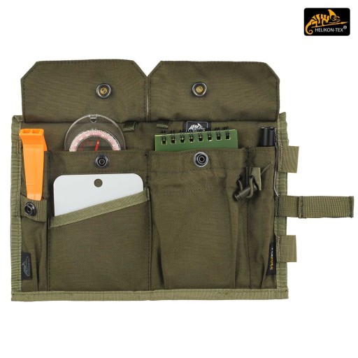 Завдяки великій системі кишень картхолдер можна використовувати як тримач для паспорта. Він має систему з 5 кишень, призначених для компаса, приладдя для малювання, лампи та письмового приладдя. Дві великі кишені, що закриваються клапанами з кнопками, для командирської лінійки, транспортира, навігаційного трикутника або конвеєра. Обидві кишені оснащені стрічковими петлями для кріплення речей. Одна з великих кишень також має еластичний шнурок зі стопором, який захищає дрібні речі від втрати. Плоска кишеня з легким доступом із зовнішнього боку ідеально підходить для компаса. Дві кишені для письмового приладдя, олівця, ручки або файнлайнера. Доступ до всіх кишень здійснюється безпосередньо ззовні, без необхідності розгортати футляр з картою.