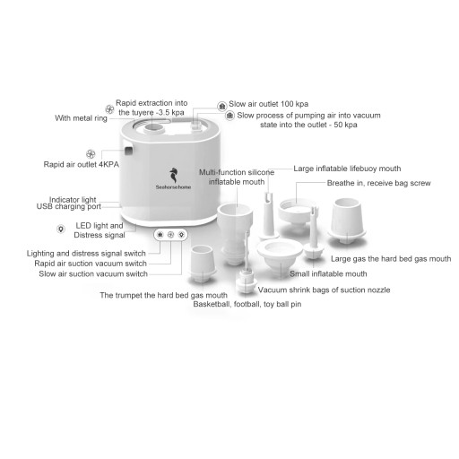 ☘Цей продукт включає в себе функції відкачування повітря, вакуумного насоса, освітлення та живлення в одному. Він маленький, міцний і зручний для перенесення, дуже підходить для активного відпочинку. ☘Технічні дані: ☘Колір: білий, чорний, помаранчевий (опціонально) ☘Акумулятор: 3,7 В, 1400 мАг ☘Матеріал: ABS #43; ПК ☘Розмір виробу: 72*48*70 мм/2,8*1,9*2,8 дюйма ☘Вага товару: 195 г / 6,9 унцій ☘Розмір упаковки: 130 * 79 * 54 мм / 5,1 * 3,1 * 2,1 дюйма ☘Вага упаковки: 225 г / 7,9 унцій ☘Пакувальний лист: ☘1 * надувний пристрій ☘1 * посібник користувача ☘1 * сумка для зберігання ☘8 * повітря струменів