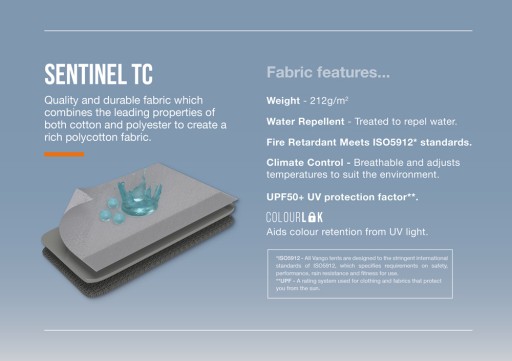 * Тканина Sentinel TC - високоякісна та міцна тканина, яка поєднує в собі провідні властивості як бавовни, так і поліестеру для створення насиченої тканини полікотон. Sentinel TC повітропроникний і має клімат-контроль, допомагаючи зберігати намет прохолодніше, коли спекотно, і тепліше в холодні умови.