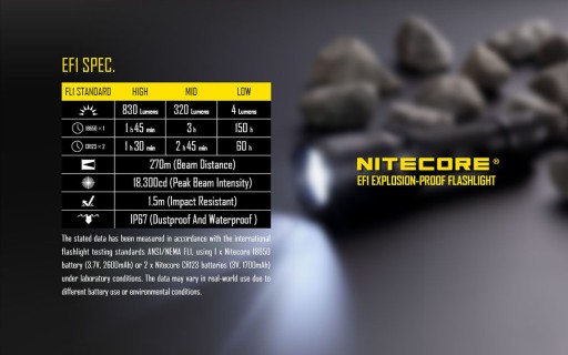 Існує близько 4000 легкозаймистих газів і речовин, які часто зустрічаються, наприклад, у гірничодобувній промисловості та на підприємствах, які використовують у виробничому процесі небезпечні сполуки. Щоб забезпечити вашу безпеку та надійне джерело світла в подібних умовах, Nitecore підготував надзвичайно міцний ліхтарик EF1, який відрізняється вражаючою довговічністю та вибухостійкістю. Він світить з потужністю до 830 лм і дозволяє 3-рівневе регулювання яскравості. Завдяки технології ATR він автоматично пристосовує свою роботу до умов навколишнього середовища.
