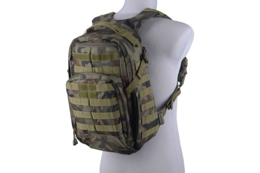Основне відділення рюкзака відкривається на блискавку, а всередині є місце для гідратаційного картриджа з гачками для кріплення та двох сітчастих кишень. На тильній стороні є плоска кишеня зі вставкою жорсткості. є 2 камери: більша, з сітки, і менша на блискавці. На лямках, боках рюкзака та його передній частині вшиті лямки модульної системи MOLLE. Завдяки їм ми можемо прикріпити додаткові кишені та сумки. Система перенесення рюкзака складається з регульованих плечових лямок з нагрудним ременем. Крім того, на спинці є комфортні накладки зі вставками з м'якого поролону, що підвищує комфорт використання та покращує вентиляцію. Завдяки фастексним пряжкам ремінь можна швидко зняти.