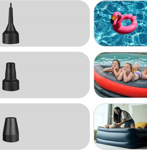 Дуже довгий дріт. Розробляючи продукти на основі відгуків клієнтів, тепер ми пропонуємо автомобільний повітряний насос довжиною 180 см, вихлопну трубу довжиною 100 см. Більше ніколи не турбуйтеся про довжину дроту! Універсальні насадки. Виберіть один із 3 розмірів насадок, щоб вибрати правильний для поставленої роботи! Ідеально підходять надувні вироби, такі як кільце для плавання, плоти, надувний басейн, надувні поплавці та надувні матраци.