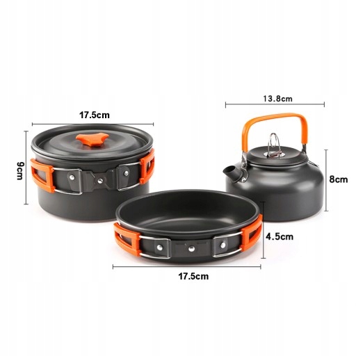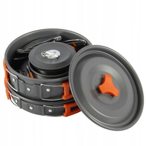 - Цей легкий, міцний набір посуду для кемпінгу включає дві каструлі, каструлю та тарілку.