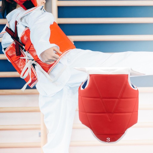 Міцний матеріал: протектор для нагрудної клітки карате виготовлено з поліуретанової шкіри, має міцні шви та делікатно вирізаний край, що робить його більш зносостійким і міцним.