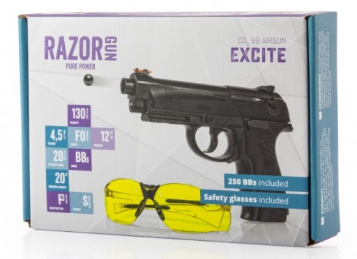 RazorGun Excite — це пневматична зброя CO2, створена на основі культового італійського пістолета Beretta 90 TWO калібру 9 мм. Корпус і замок пневматичної зброї виготовлені з легкого полімеру, стійкого до погодних умов і механічних пошкоджень.