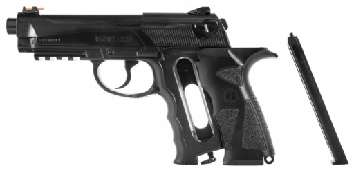 Використані протиковзкі текстуровані підкладки та анатомічно профільована рукоятка забезпечують стабільність рукоятки, ергономіку та комфорт при стрільбі. Рукоятка вміщує металевий магазин ємністю 20 куль 4,46 мм.