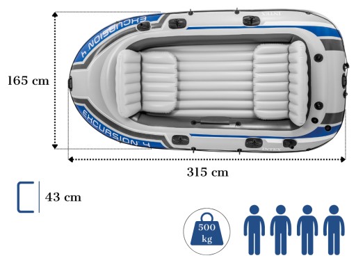 Excursion 4 є однією з найбільших серій цих надувних човнів. У цьому випадку його можуть використовувати максимум 4 людини, що гарантує розміри 315x165x43 см і водотоннажність до 400 кг. З боків є кріплення для весел і міцний шнур.