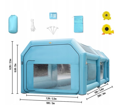 АКСЕСУАРИ. Наша камера для розпилення постачається з повним обладнанням, включаючи сумку для зберігання, повітродувку на 680 Вт, вентилятор на 330 Вт, мотузки, сумки та ремонтні латки.