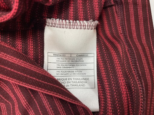 - Блуза бордового кольору з лампасами більш світлого відтінку. Має короткі рукави та комір, який застібається на три гудзики з логотипом. Знизу має витончені прорізи. Є запасна кнопка.