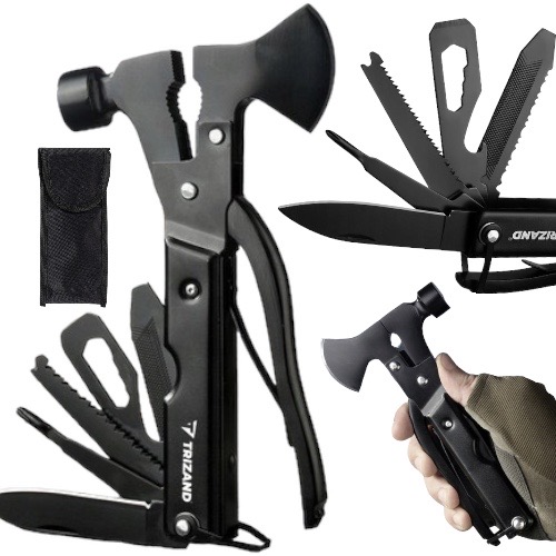 Продукт має цілих 17 вбудованих ви можете мати справу під час виживання, риболовлі, походів, кемпінгу, кемпінгу, наметів, на роботу чи просто під час садівництва. У мультитул входять: сокира, кусачки, напилок, скребок для риби, шлицева викрутка, шестигранний ключ, гарпун, відкривачка для пляшок, пилка по дереву, хрестова викрутка, кишеньковий ніж, молоток, кусачки, кл іщі, плоскогубці, бампер і замок.