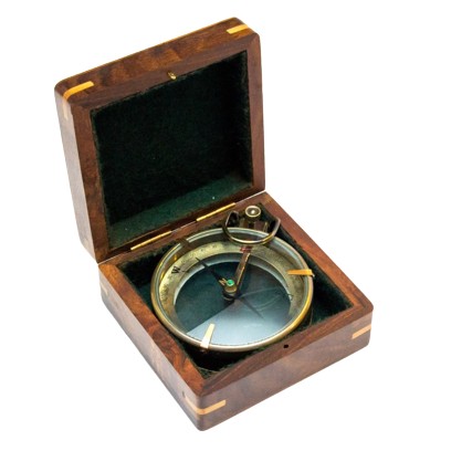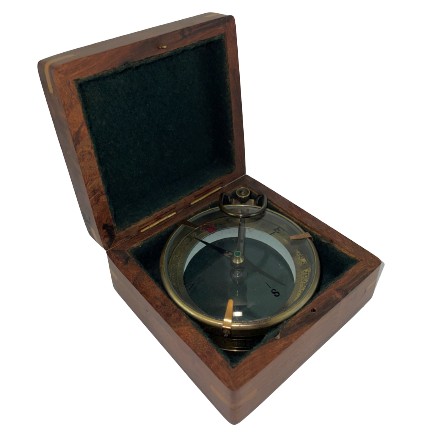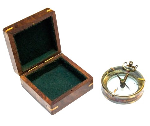 Компас Спенсера в коробці з палісандра. Красива копія пристрою від британської компанії Spencer & Co. з 1905 року З одного боку — компас, з іншого — лупа — прилад використовувався для читання деталей карт.