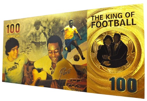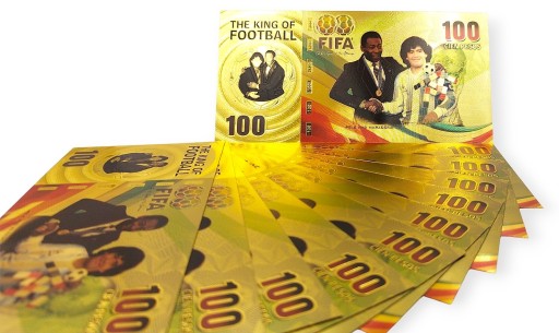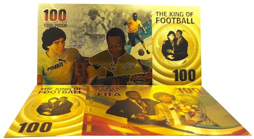 Красива позолочена банкнота із зображенням зірок світового футболу Пеле та Марадони.