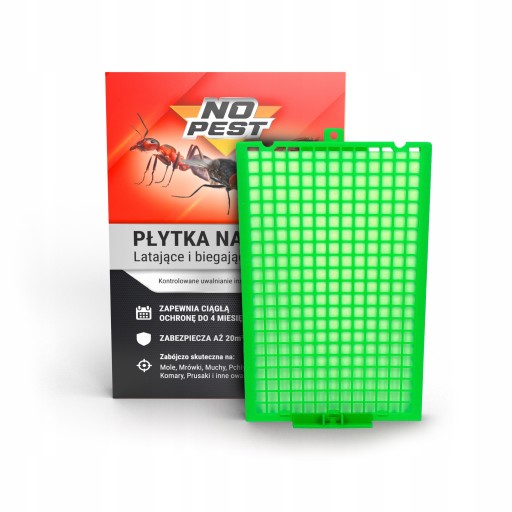 Плитка призначена для використання всередині приміщень і бореться з такими комахами, як моль, мухи, комарі, таргани, мурахи та інші бігають і літаючі комахи. Продукт No Pest також характеризується тривалою роботою. Діє до 4 місяців.