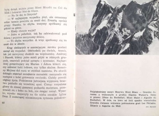 : Книга Леха Утрацького - польського мандрівника, альпініста та альпініста, учасника високогірної експедиції в Альпи 1957 року, що завершилася трагічною загибеллю двох польських альпіністів. Це своєрідний експедиційний щоденник, у якому автор особисто описує зусилля та успіхи альпіністської команди, знайомить читача з труднощами, які виникають під час цього типу експедицій, і як з ними боротися. Книжка закінчується глосарієм високогірного діалекту та термінів. Тираж книги: 10225 примірників