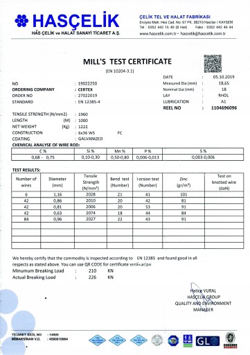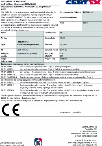 - Конструкція кабелю 6x19M-FC відповідно до PN-EN 12385. Ця конструкція відповідає вилученим стандартам PN-M-80229 і DIN 3064.