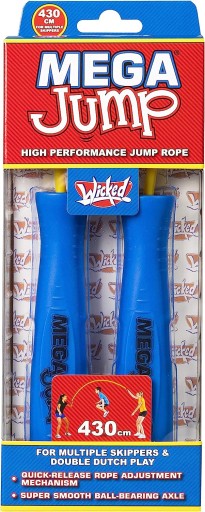Стрибай як професіонал з новим Wicked Mega Jump! Незалежно від того, чи ви новачок, чи просунутий, надзвичайно плавний поворот є ключовим, тому Mega Jump має високоякісні шарикопідшипники, які забезпечують надзвичайно плавний поворот. Звичайно, спочатку мотузка повинна мати правильну довжину для стрибуна, тому завдяки спеціально розробленому механізму звільнення мотузки дуже легко відрегулювати довжину для кожної людини. Просто зніміть кришку, зніміть затискач і відріжте мотузку за розміром, це так просто! Від простих трюків, таких як X, до складних трюків, таких як TJ, чудові функції Mega Jump допоможуть вам швидко стати професіоналом!