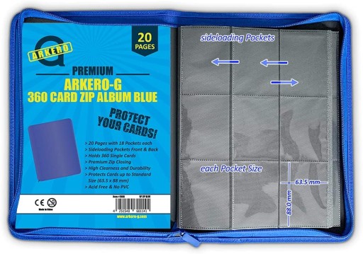 - Arkero-G: Біндер преміум-класу на блискавку з 18 кишенями синього кольору. Розмінний альбом зі штучної шкіри високої якості містить 20 щільно склеєних сторінок, кожна сторінка має 9 кишеньок спереду та ззаду.