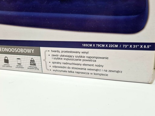 Одномісний матрац виготовлений з міцного і міцного вінілу, а його верхня частина покрита м'яким велюром, щоб зробити відпочинок приємнішим. З'єднання верхнього і нижнього шарів матраца з камерами відповідає за структурну міцність і еластичність матраца. Має клапан швидкого випуску повітря з замком.