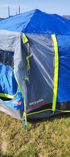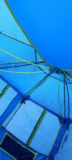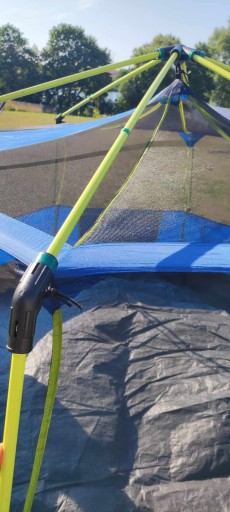 Просторий намет, виконаний у формі восьмикутника. Є два інноваційних і практичних входу в намет, встановлених на петлях. Вони дозволяють залишати двері відкритими. Вікна, розташовані на всіх стінах, гарантують чудовий панорамний вид на 360 градусів. Вони також ідеально підходять як вентиляційні отвори. 100% водостійка підлога захищена від механічних пошкоджень.
